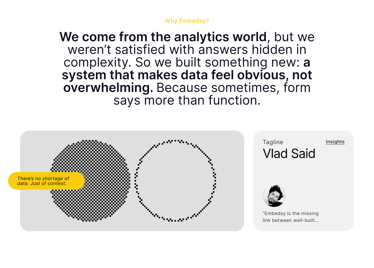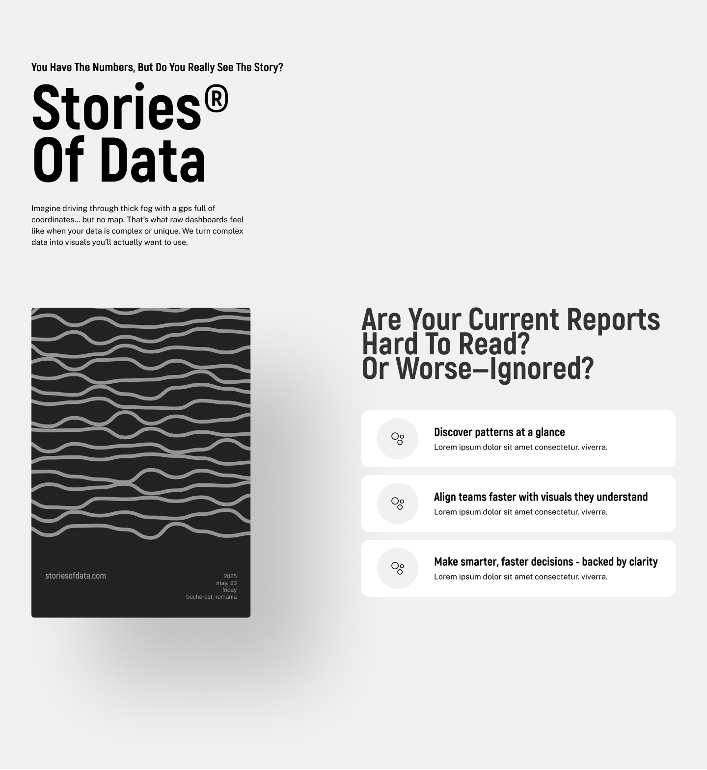 This ongoing project merges two sister brands—Embedsy, a Power BI Embedded analytics platform, and Stories of Data, a contextual analytics and data visualization service, under a unified design direction. I'm creating landing pages, one-pagers, and social content that translate data complexity into clear, engaging visuals with tangible business impact.